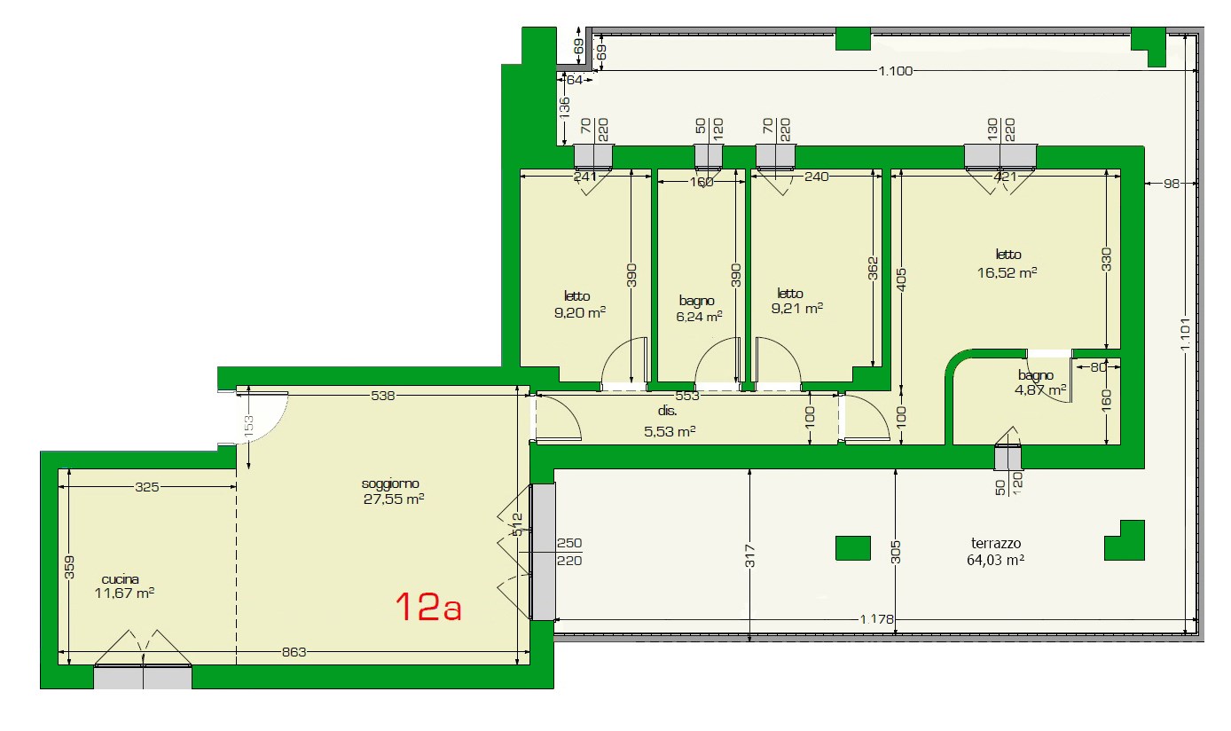 L'immobile è posto al secondo piano con ascensore, composto dall'ampia e luminosa zona living con soggiorno cucina di 40mq ed il primo accesso alla splendida terrazza di 64,12 mq che serve tutto l'immobile , reparto notte con tre comode camere da letto, due bagni.