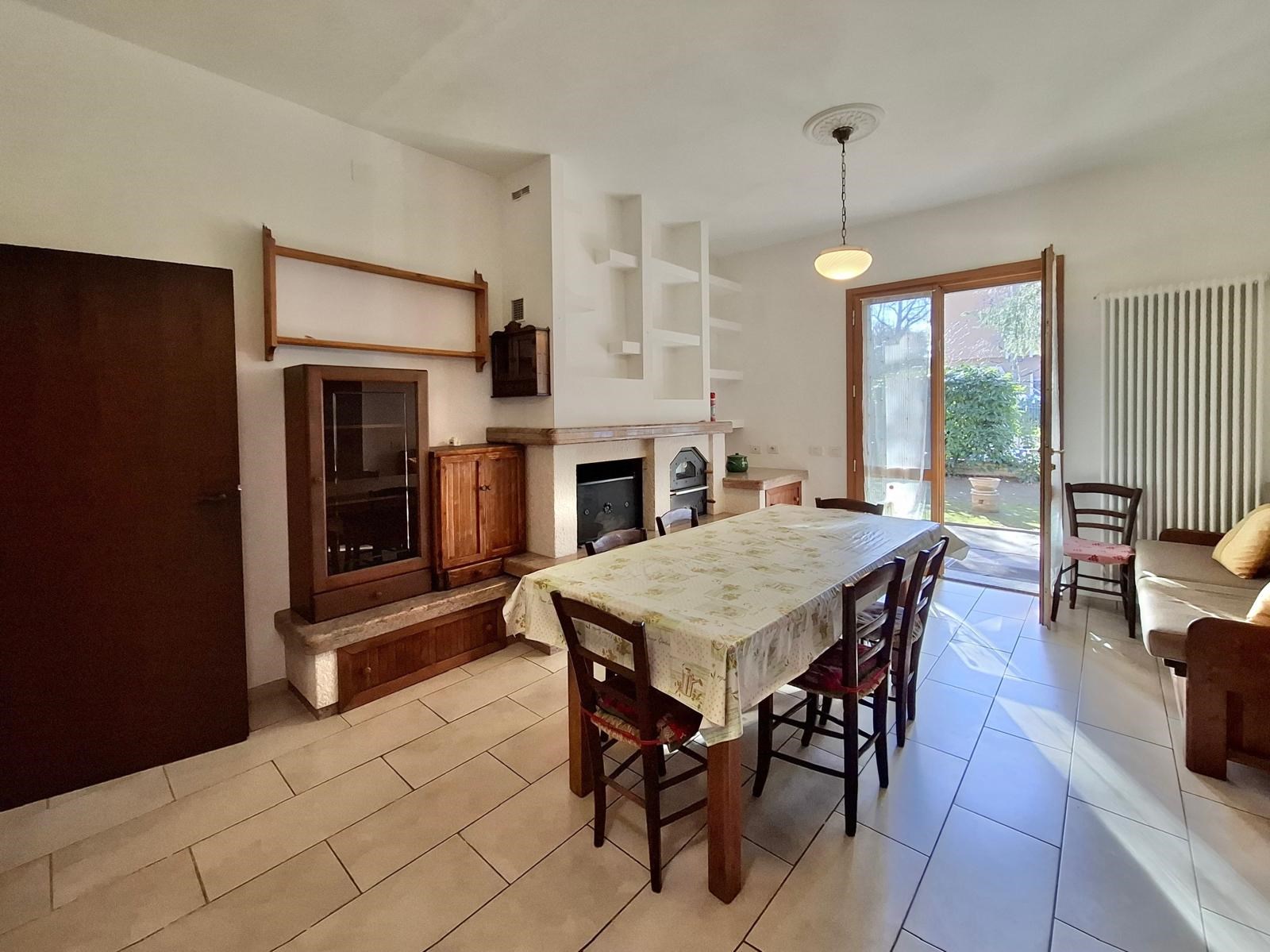 Al pian terreno si accede all'ingresso dall'ampio porticato sul fronte della casa, da cui è possibile accedere alla prima unità (dotata anche di ingresso indipendente dalla corte esterna), composta da soggiorno con cucina a vista e ampio camino con forno a legna, due camere da letto e bagnoSempre dal primo disimpegno si raggiunge il garage doppio di oltre 40mq e la cantina interrata