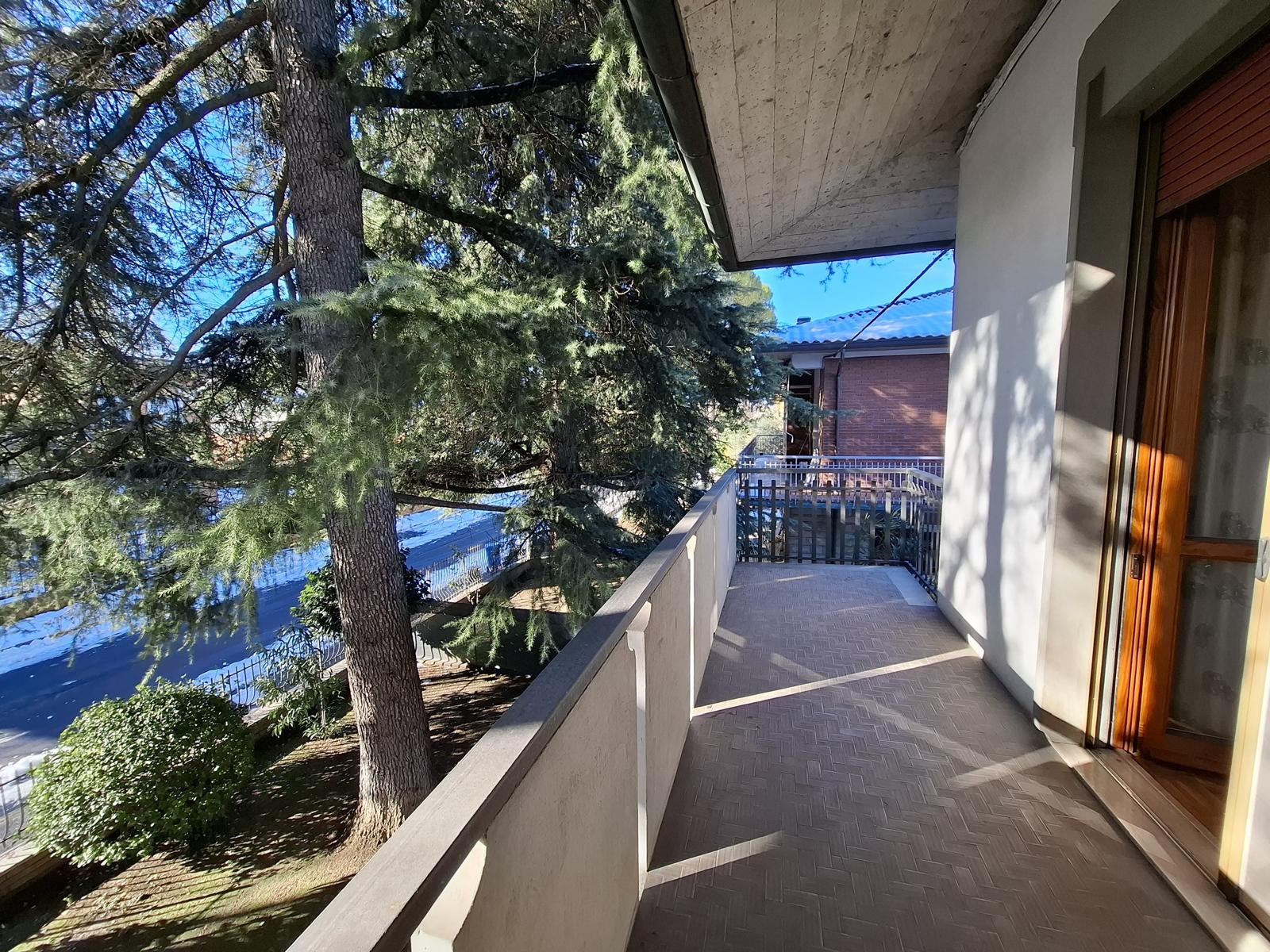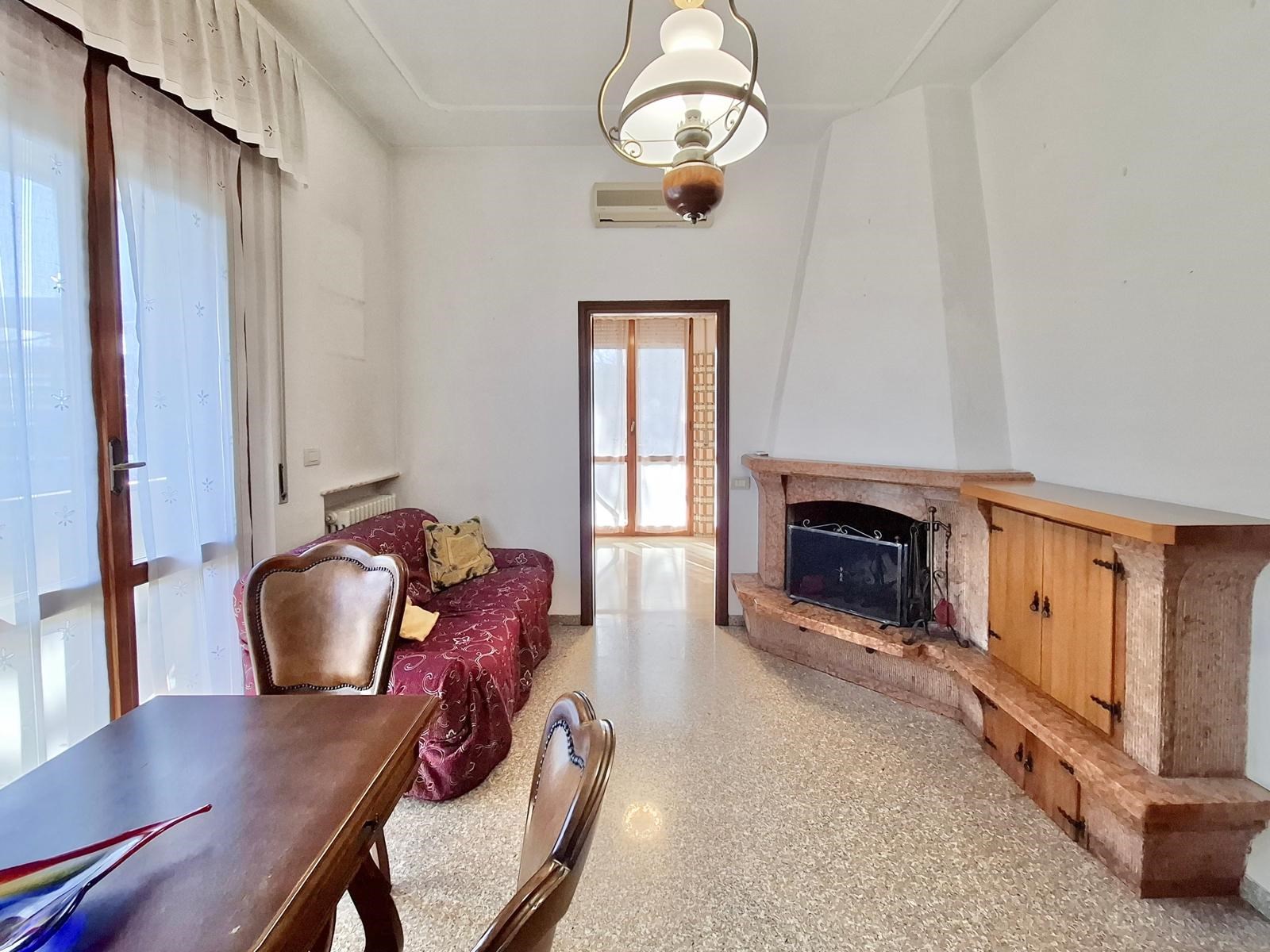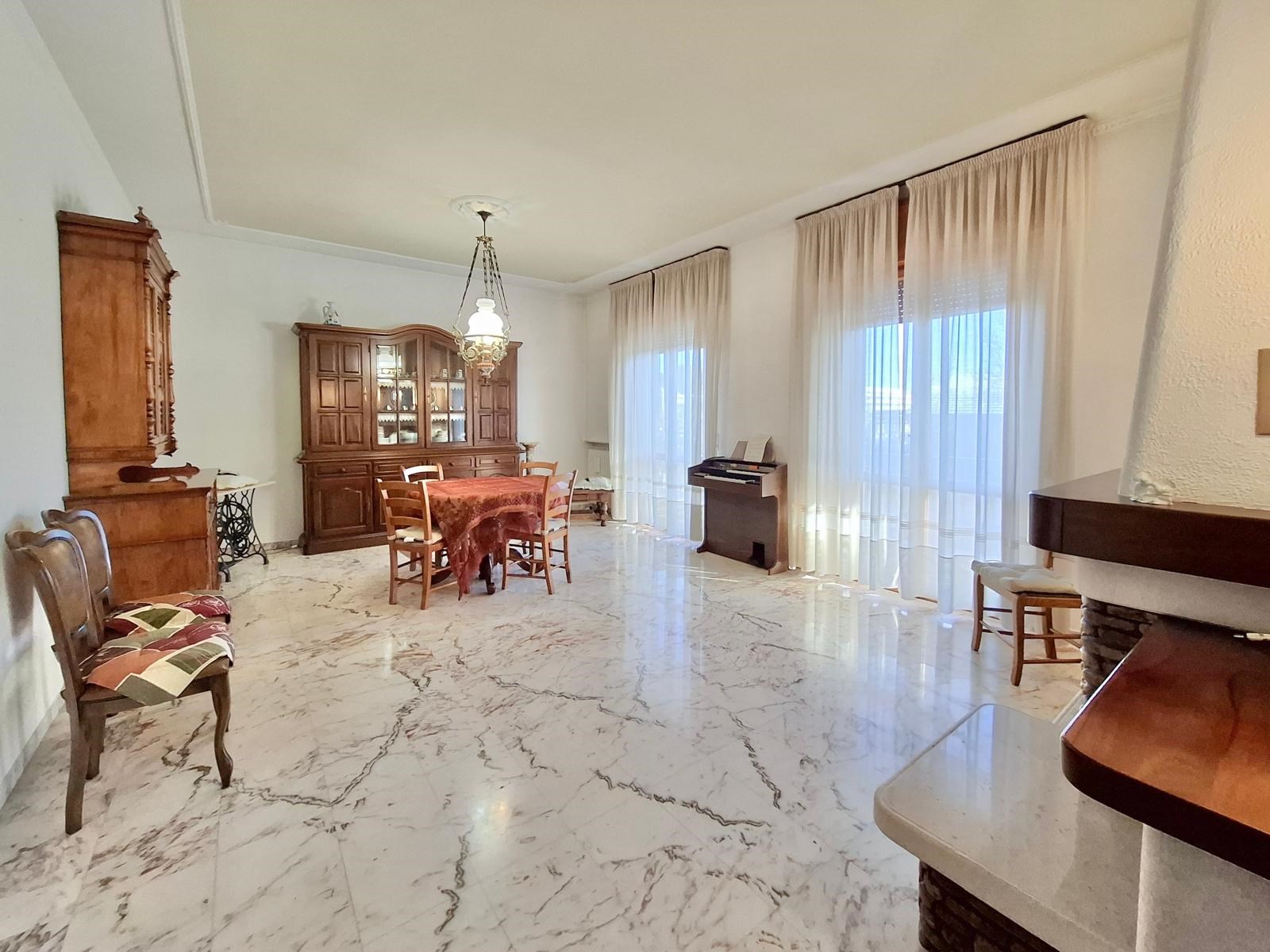 Salendo al primo piano, l'elegante scala in granito porta all'appartamento principale, di oltre 120mq calpestabili e ottimamente rifinito. Dall'ingresso si accede all'ampio salone, con camino tradizionale e accesso all'ampio balcone, e alla sala da pranzo con cucina annessa, sempre con accesso al balcone