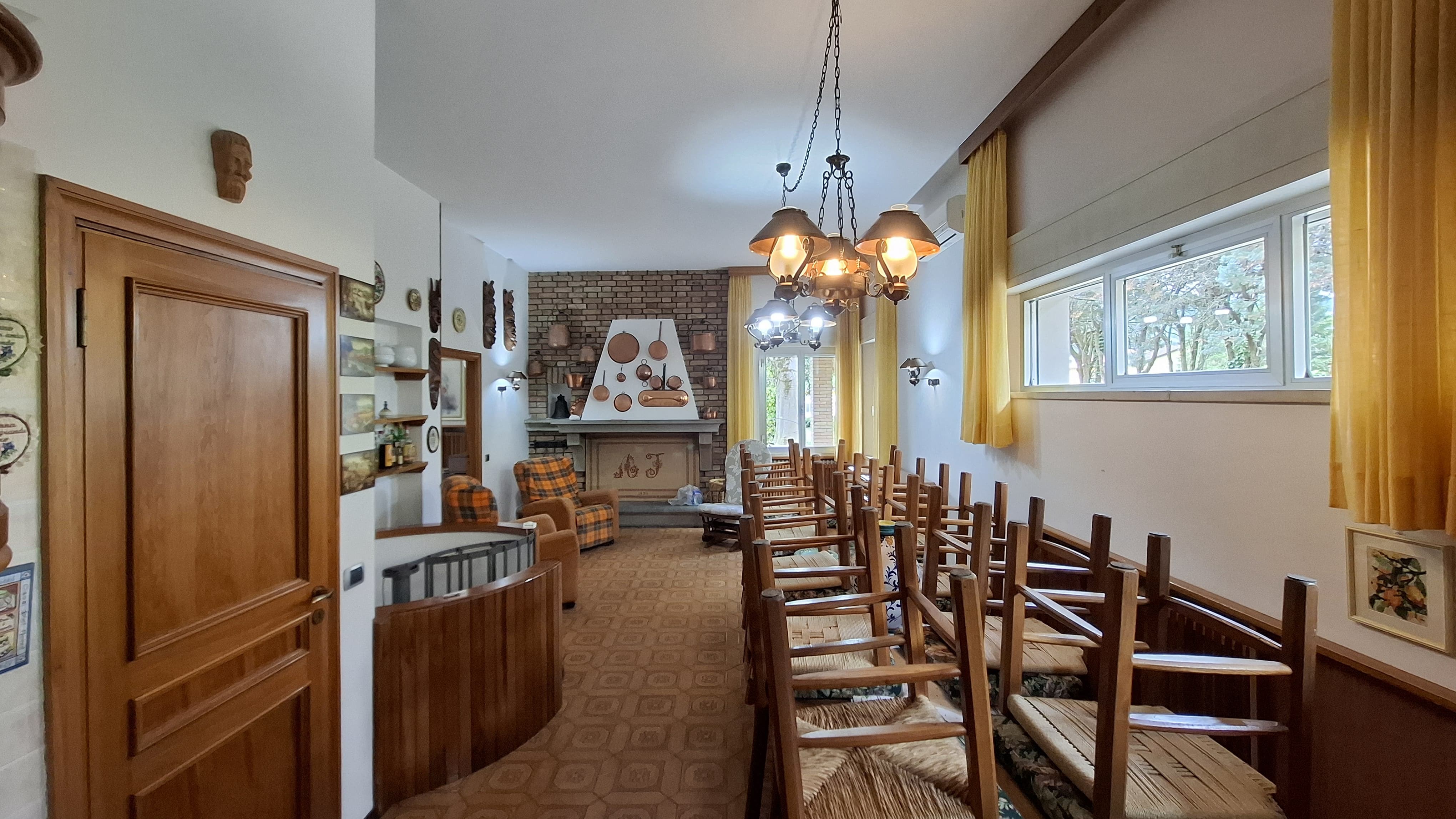 • Primo Piano: troviamo il grande salone con camino di 50mq, sala da pranzo, cucina, tinello, dispensa, bagno di servizio, tre camere matrimoniali (di cui una con cabina armadio e bagno privato) e un altro bagno a servizio delle altre due camere.