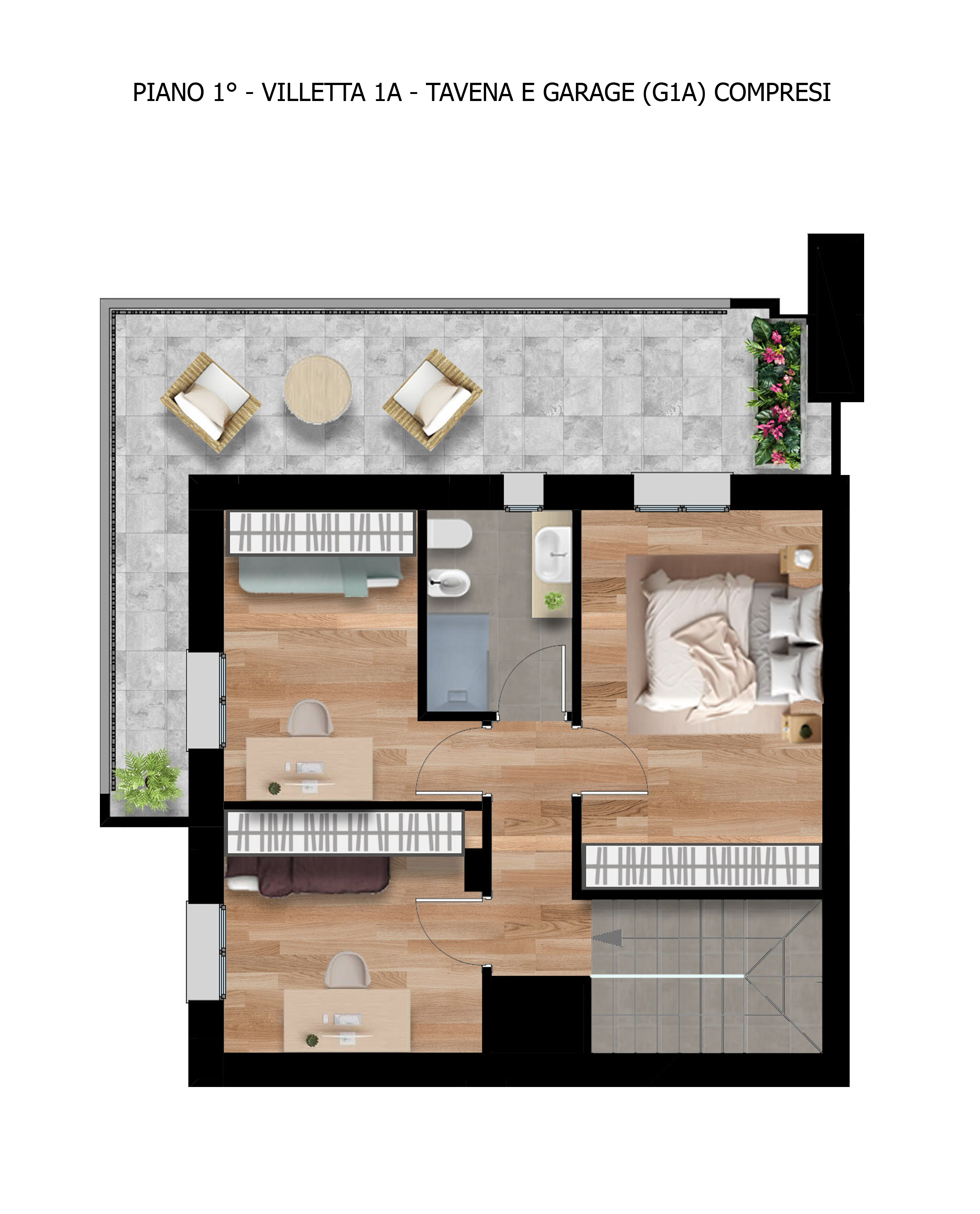 Salendo al primo piano troviamo il reparto notte, composto da tre comode camere da letto, bagno finestrato e terrazzo di 22 mq