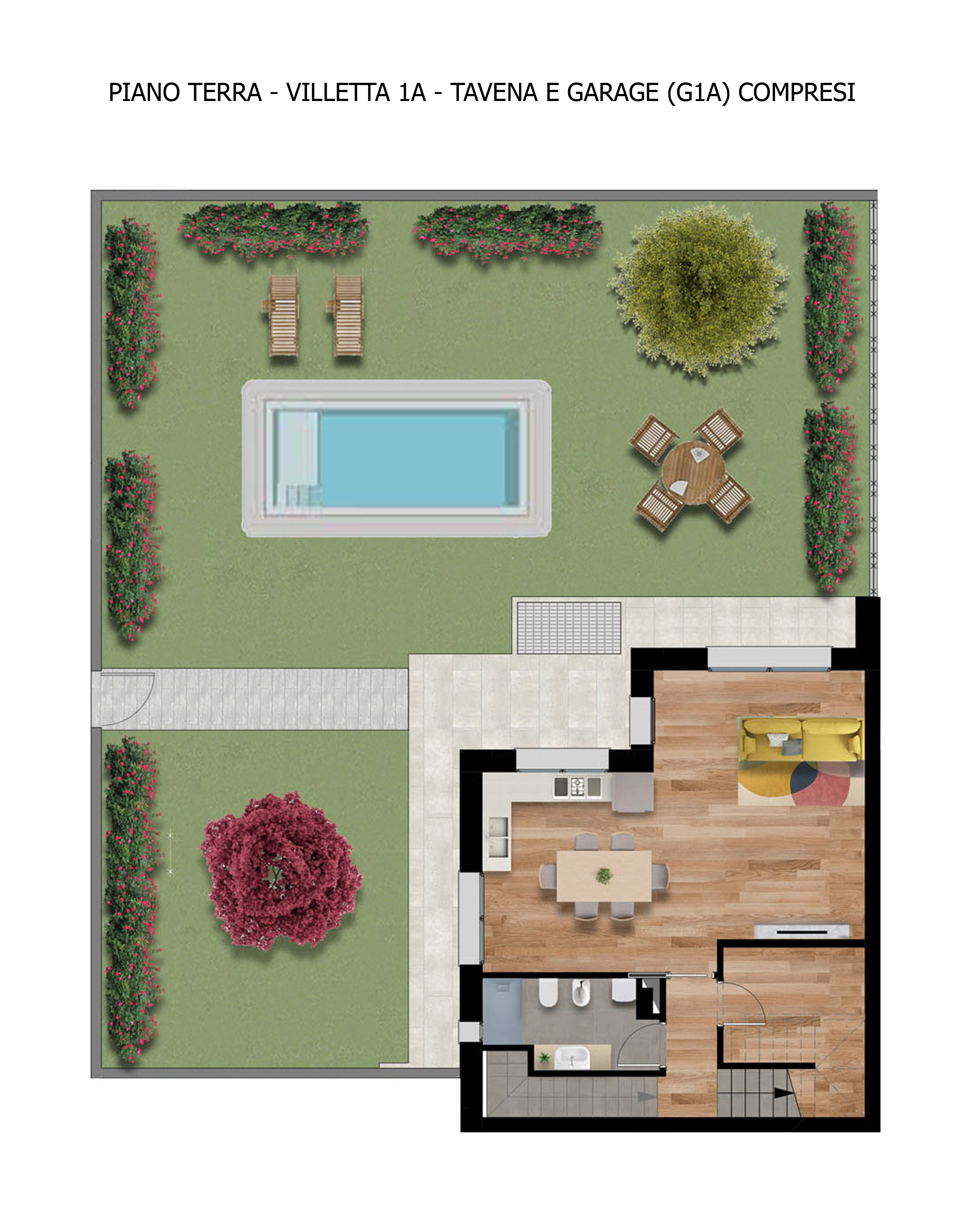 Al piano terra troviamo un'ampia zona giorno open space di 35 mq, bagno finestrato e locale tecnico perfetto come lavanderia