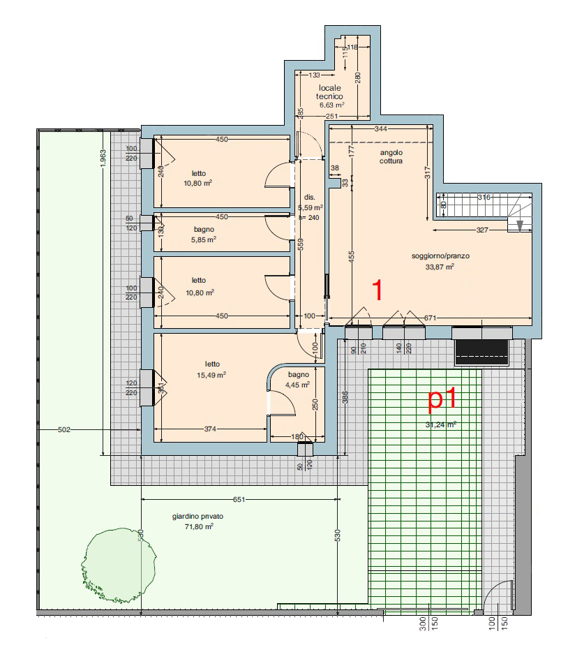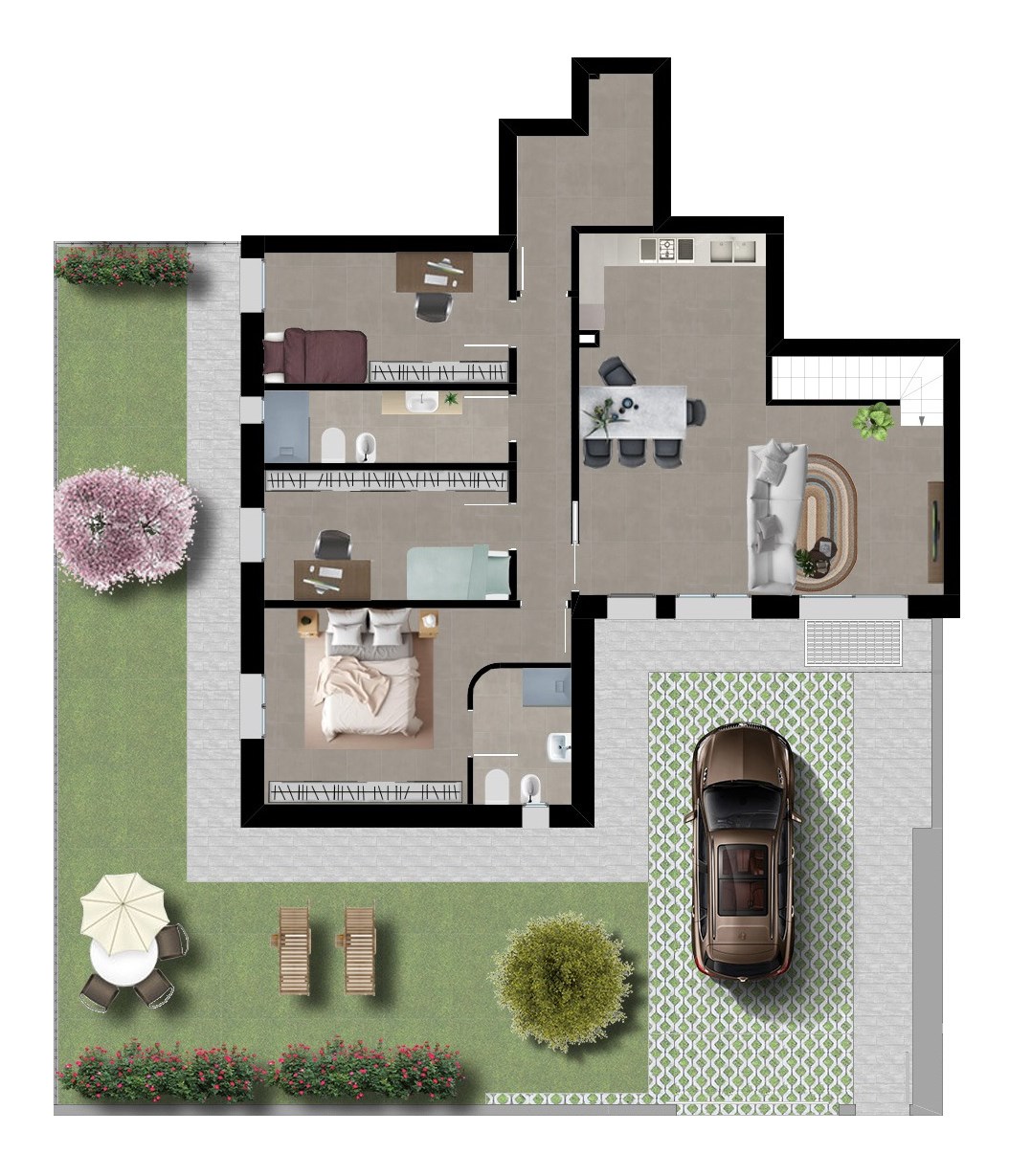 L'immobile è posto al pian terreno, dotato di ingresso indipendente e ampio giardino privato angolare di 100mq comprensivo di posto auto privato, e composto dall'ampio soggiorno con zona living e zona cottura per un totale di 34mq, da cui si accede alla tavernetta interrata tramite la scala interna e, sempre al pian terreno, al reparto notte: tre comode camere da letto (padronale e 2 doppie), due bagni finestrati e un comodo locale tecnico perfetto per essere adibito a ripostiglio/lavanderia ad incrementare il comfort e la gestione della casa