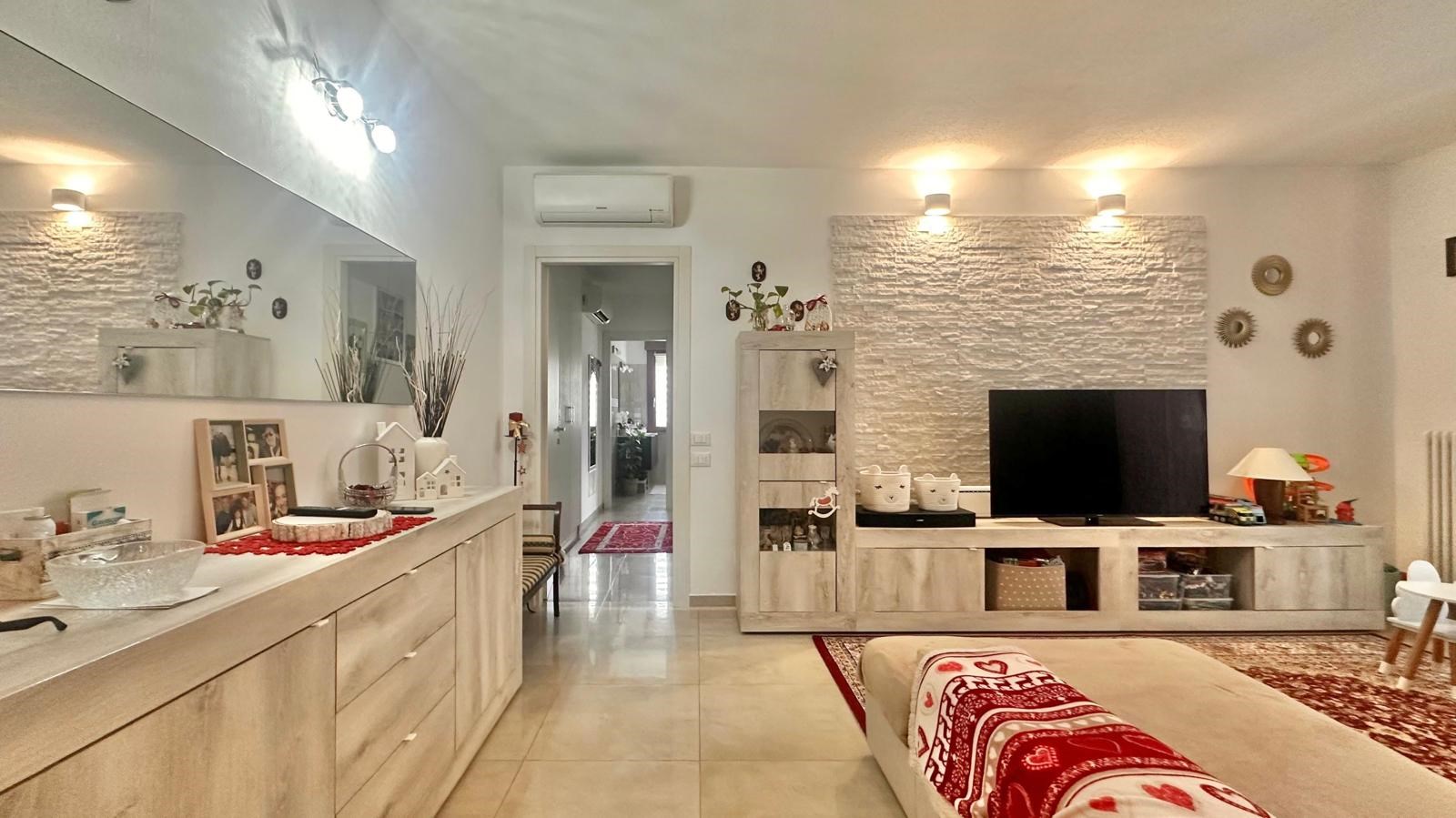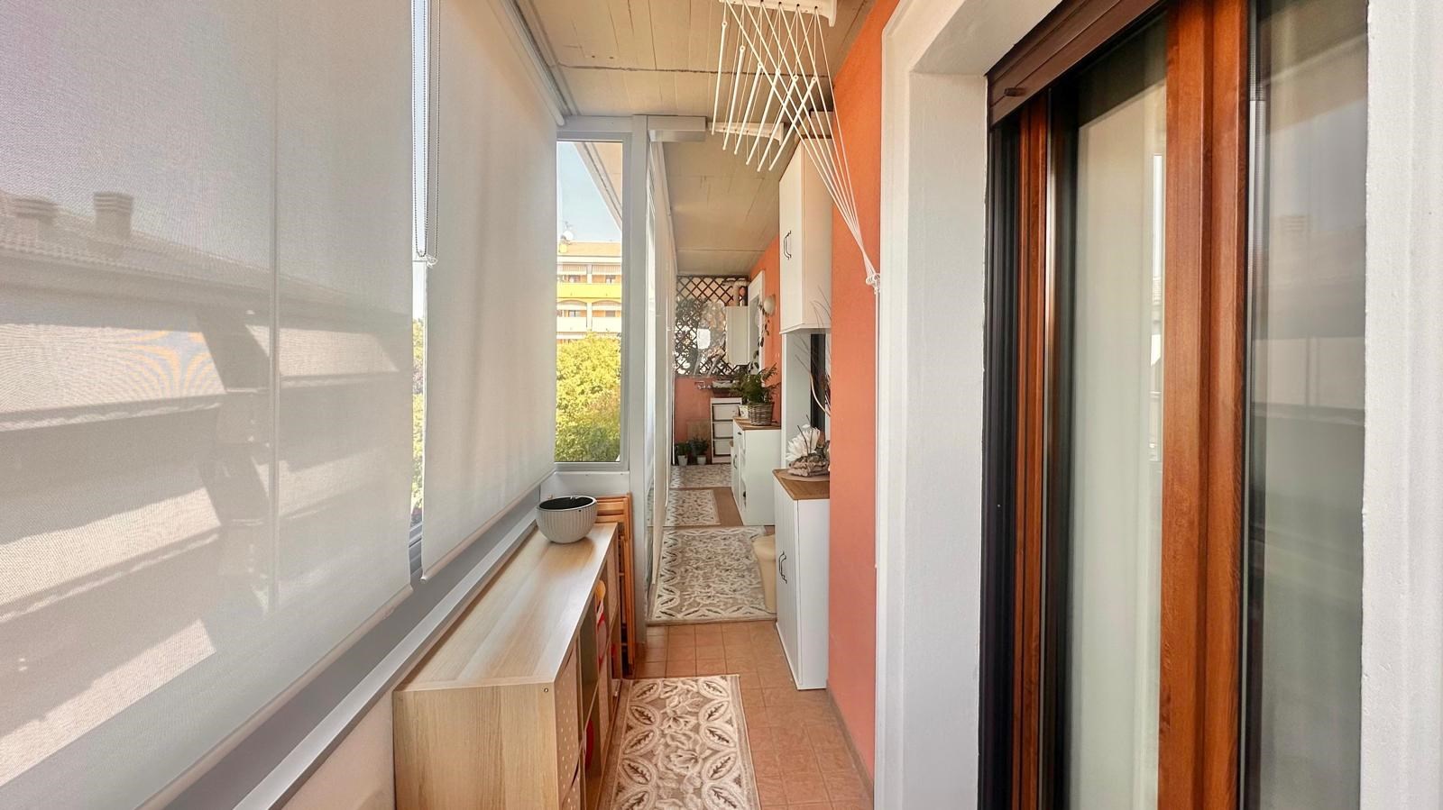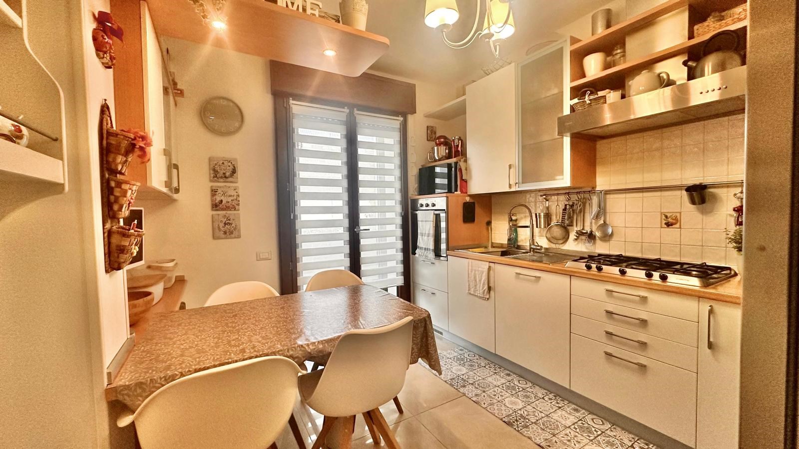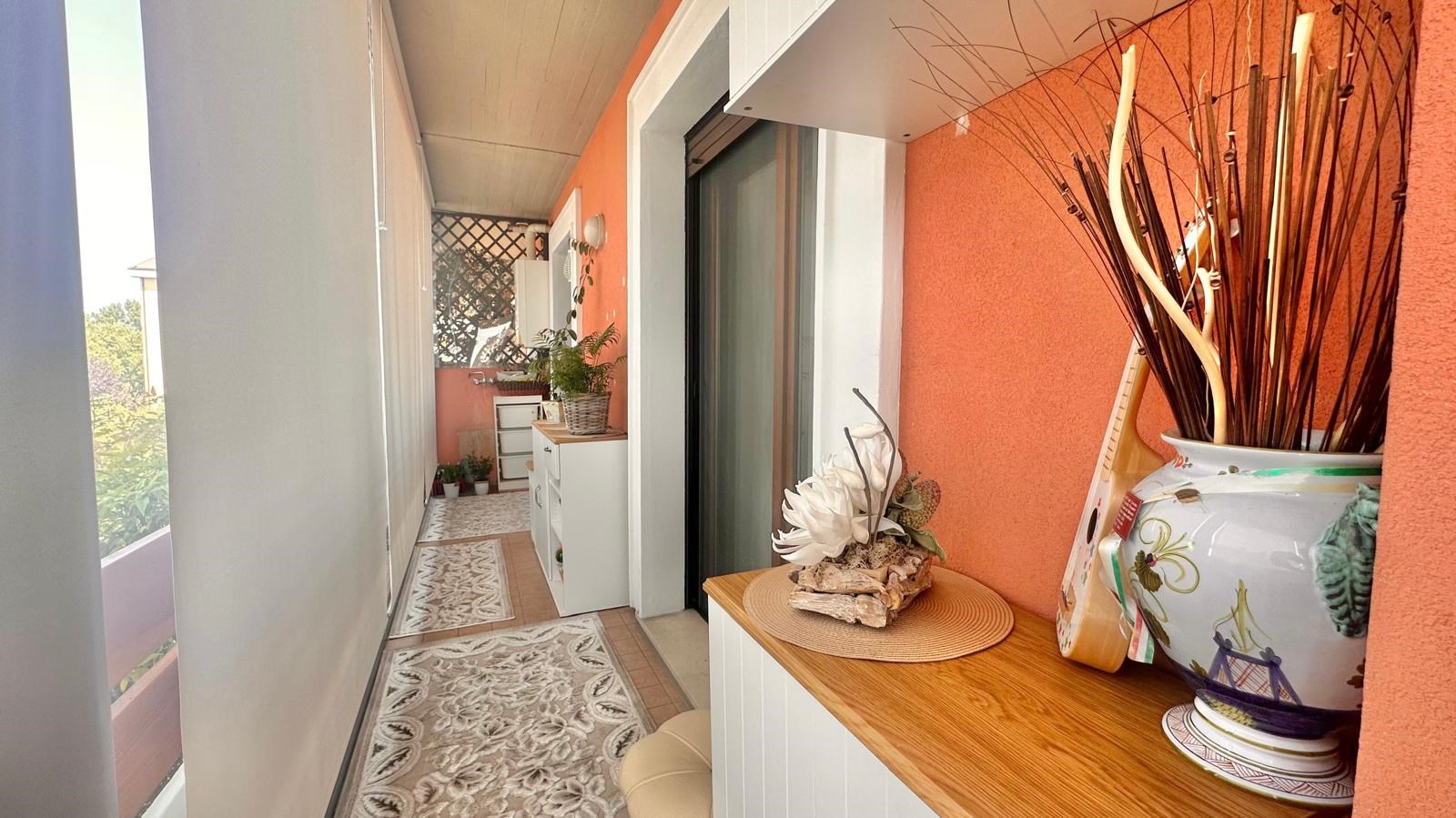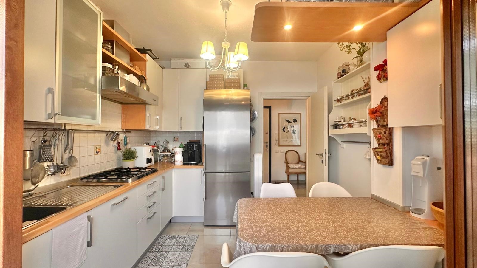 E' composto da ingresso, raffinato e luminoso soggiorno, cucina abitabile separata, due camere da letto, due bagni e terrazzo verandato