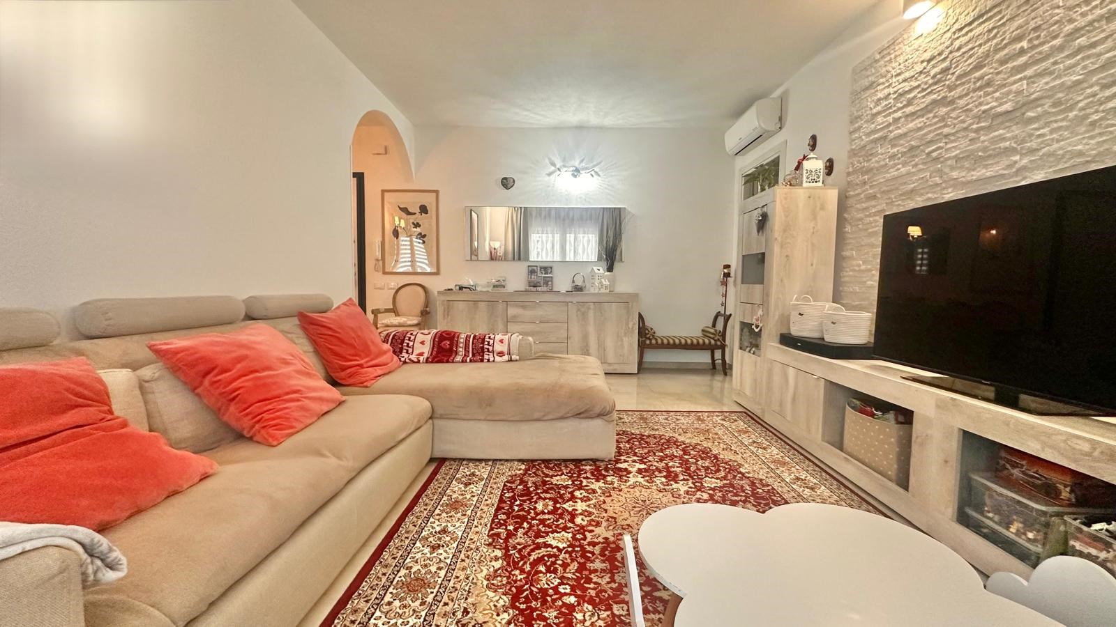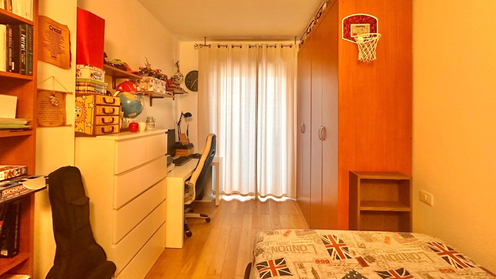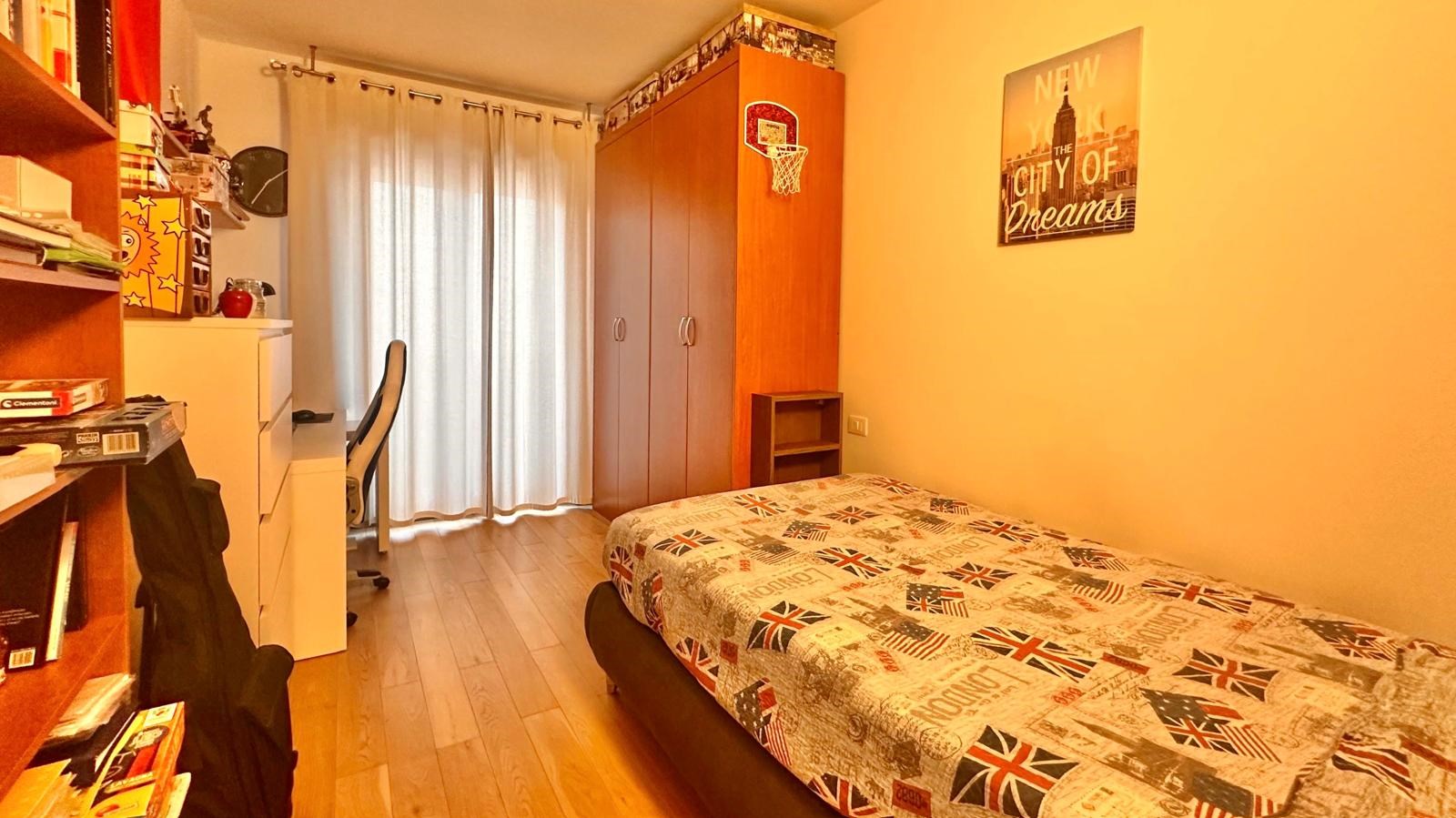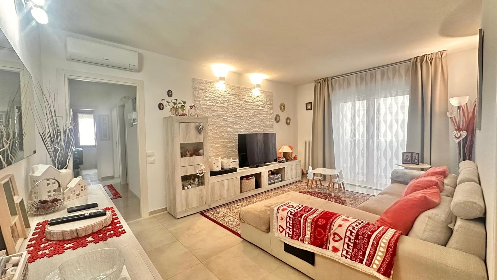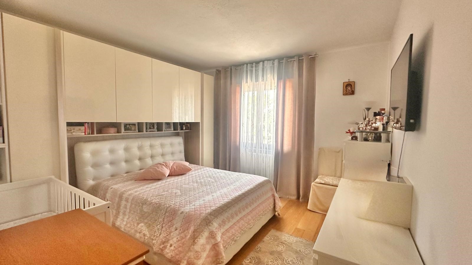 E' composto da ingresso, raffinato e luminoso soggiorno, cucina abitabile separata, due camere da letto, due bagni e terrazzo verandato